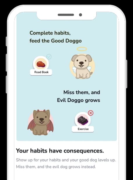 Each day your habits determine which side wins. Consistency feeds the Good Boi, while skipped habits empower the Bad Boi.